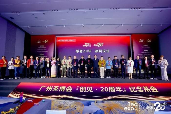 广州茶博会以「创见?20周年」纪念茶会致敬二十年合作伙伴。200多位茶企掌舵人、行业协会领导、资深茶人齐聚一堂,通过“源起、复兴、赓续”三大篇章复盘中国茶业高速发展历程,共同品鉴珍稀年份茶,见证中国茶从产业升级到文化自信的历史性跨越。现场更颁发了20年行业引领奖等重磅荣誉,感恩一路同行的坚守与创新。