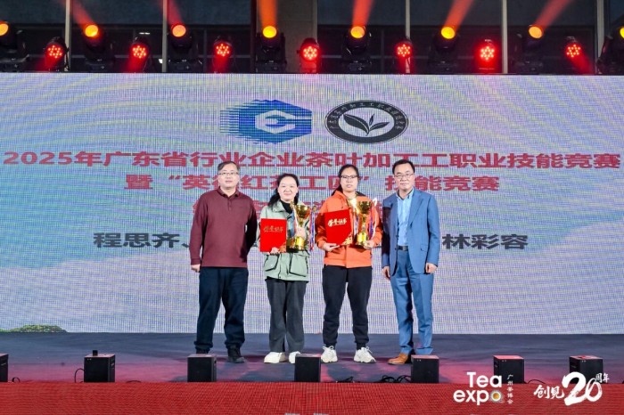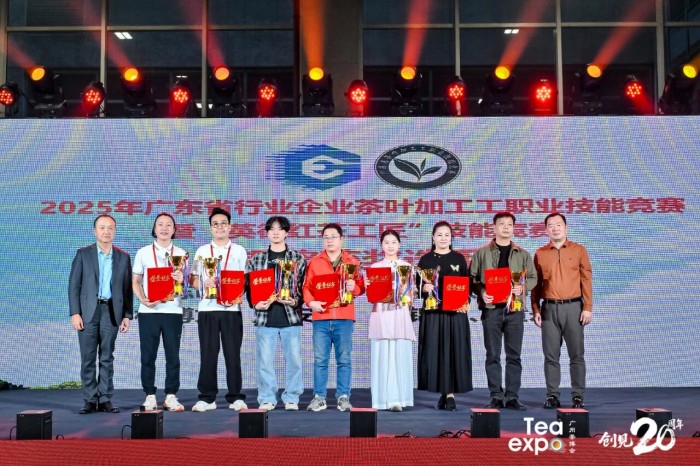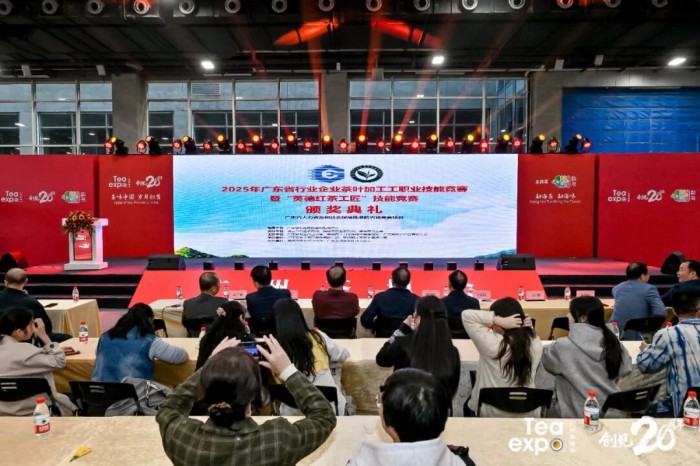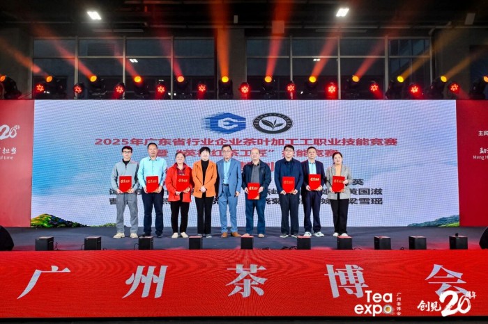 11月21日,2025中国(广州)国际茶业博览会开幕第二天,在展会现场,广交会展馆B区10.2馆会议室,举行了2025广东省茶叶加工工职业技能竞赛颁奖典礼。