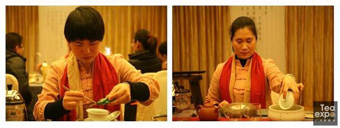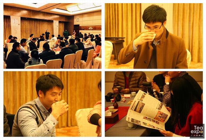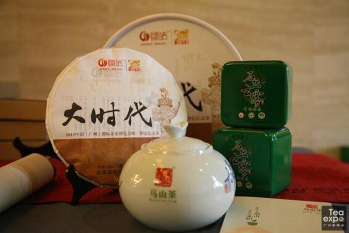 在传茶寄意环节,嘉宾们带来了各具特色的一泡茶。益武展览胡卫红董事长带了2015广州茶博会唯一指定纪念茶“国皓·大时代”普洱茶,这是广州茶博会创见十年的纪念茶,很有意义,梅州市农科所所长谢岳昌先生带来了在生产上有创新的客家绿茶茶饼,平远源丰公司总经理沈允锐先生带来了“石正云雾”有机绿茶,马山茶业总经理饶幸霞女士带来了“马山银针一号”,