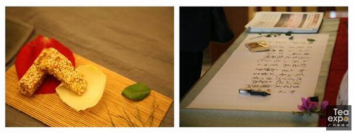 第三道茶品的是2015中国(广州)国际茶业博览会唯一指定纪念茶“国皓·大时代”普洱茶,条索肥壮匀净,色泽乌黑油润,清香明显,滋味厚实饱满,汤色黄绿明亮,叶底嫩匀肥厚、韵味悠长、至纯至臻。
