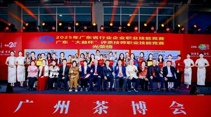 由广东省人力资源和社会保障厅批准立项、广东省职业技能服务指导中心指导、广东省茶业行业协会、2025中国(广州)国际茶业博览会主办,大益集团/勐海茶业有限责任公司冠名,广东省茶业行业协会、广州益武国际展览有限公司承办,广东省高级评茶师学会及广东省相关茶叶协会商会协办的——2025广东省行业企业“大益杯”评茶技师职业技能竞赛在主办及协办单位的共同努力下,在广大企业和参赛选手的积极参与下,于11月14-16日、11月20日分别在广州国茶荟及广州茶博会经过严格、公平、公正的理论和综合能力、技能操作考核圆满完成了所有赛程。11月22日下午,在2025中国(广州)国际茶业博览会举行隆重的颁奖典礼。中国茶叶流通协会荣誉会长、广东省茶业行业协会会长、大赛组委会主任穆有为;广东省茶业行业协会专职副会长、本次竞赛组委会副主任张黎明;广州益武国际展览有限公司董事长、本次竞赛组委会副主任胡卫红;本次竞赛裁判长、广东省茶业行业协会副会长、华南农业大学园艺学院茶学系教授曹藩荣;广东省茶业行业协会副会长吕小勤;广东省茶业行业协会副会长、东莞市茶叶行业协会主席卢树勋;广东省高级评茶师学会秘书长张蕾;深圳市茶业协会荣誉会长李浩;勐海茶业有限责任公司/勐海茶厂副总经理邵爱菊;大益茶业集团营销中心执委(常务副总)李刚;广州益武国际展览有限公司董事总经理李广韬出席了本次颁奖典礼。