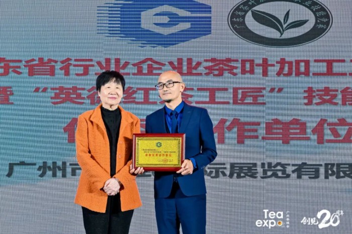 广东省茶业行业协会专职副会长、本次竞赛组委会副主任张黎明为竞赛优秀合作单位广州益武国际展览有限公司颁奖